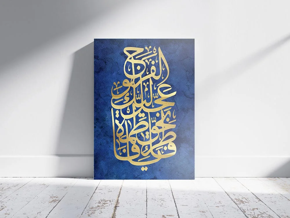 Printed on premium glossy, fade-resistant photo paper with high-resolution digital printing for rich blue tones, warm gold shimmer, and crisp calligraphic detail. Available in A1 (594 x 841 mm), A2 (420 x 594 mm), and A3 (297 x 420 mm) sizes to suit any space.